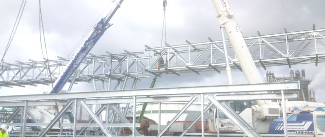 Bei den geplanten Baumaßnahmen handelt es sich um eine Rohrbrücke zur Aufnahme von Rohrleitungen und Kabeln für ein Stickstoffwerk.