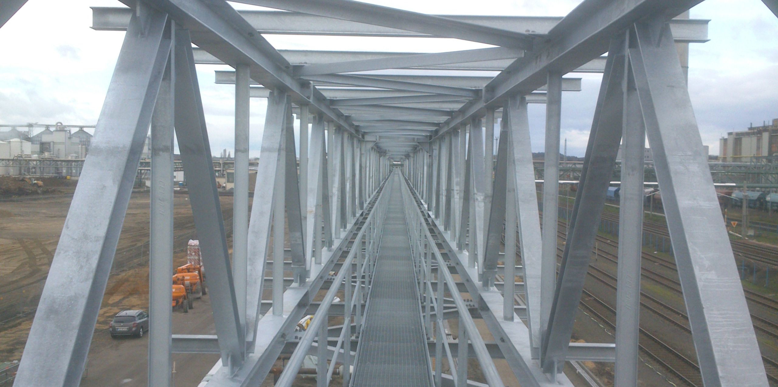 Unsere Leistungen bestanden aus der Erstellung der kompletten Werkstattpläne (Werkstattzeichnungen, Stück- und Montagelisten), der Lieferung der Verankerungselemente zum Einbau in den Rohbau und dem Herstellen, Liefern und Montieren der gesamten Rohbrückenkonstruktion.