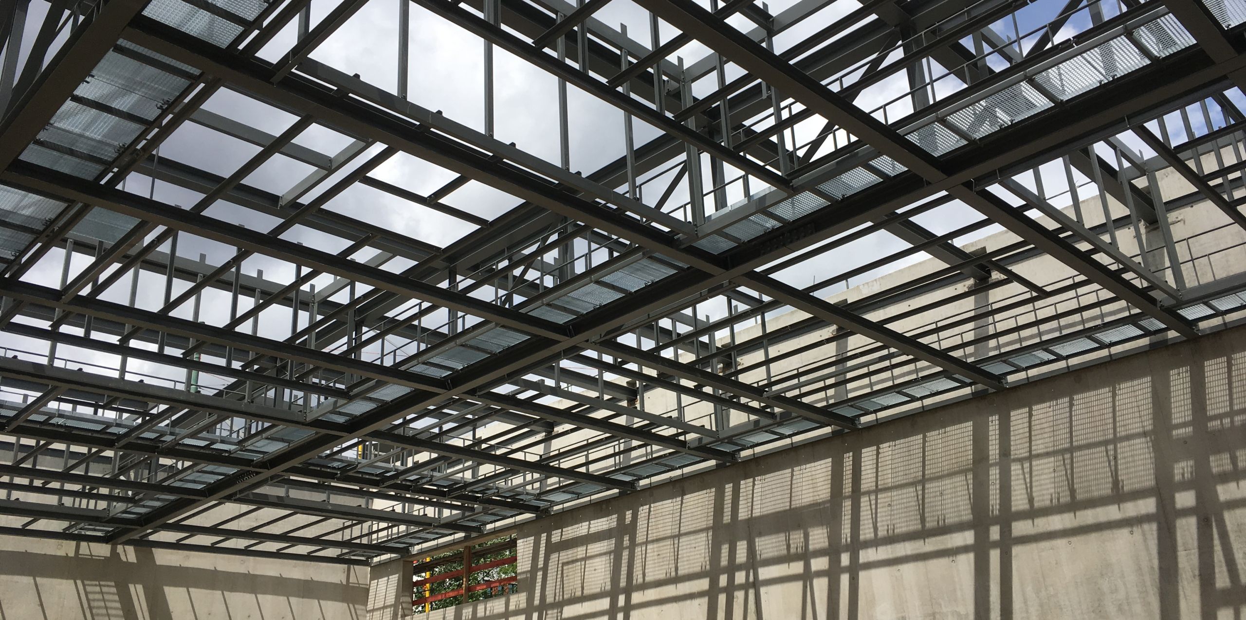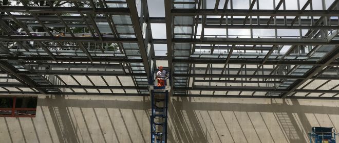 Das Hauptgerüst der Sporthalle wird von vier Stahlfachwerkbindern mit einer Überhöhung von 120 mm gebildet.